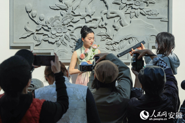 肥东包公故里文化园,摄影爱好者与景区NPC互动。人民网记者 张俊摄