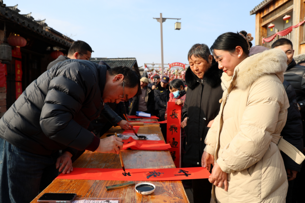 互动区更是趣味十足。定制的打卡墙前人头攒动,游客纷纷留下新春第一张“福照”;“套马”游戏区、转盘抽奖区、民俗知识有奖竞答区同样人气爆棚,游客排起长队,凭实力赢取价值1元的“肥年通宝”,可在年货市集直接抵现使用,真正体验回“玩着就把年货办了”的乐趣!墨香迎春,福气盈门。现场,书法名家们泼墨挥毫,将一幅幅满载吉祥的春联送到游客手中,传递红红火火的祝福。
