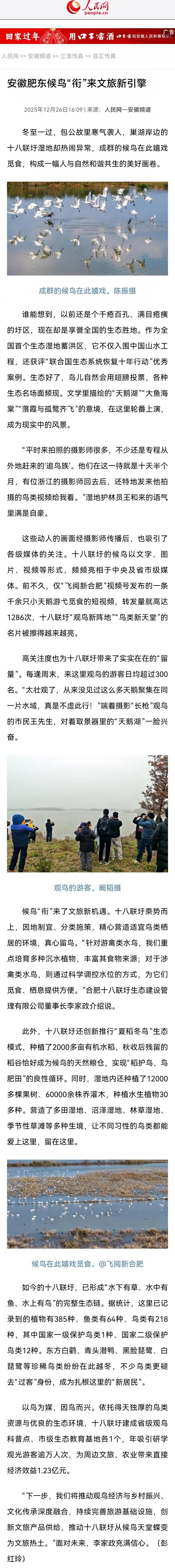 人民网|安徽肥东候鸟“衔”来文旅新引擎