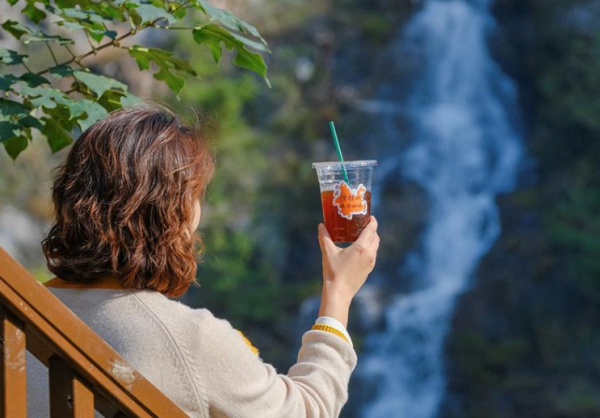 在浮槎山,手捧咖啡与瀑布合影,尽享秋日闲适。海燕摄
